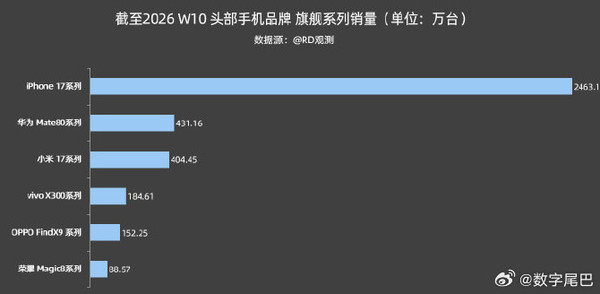 【CNMO科技音书】近日,数码博主@RD不雅测 曝光了2026年第10周的头部手机品牌旗舰系列的销量数据。统计裸露,iPhone 17系列以十足上风领跑商场,总销量达到2463.1万台,在各大品牌旗舰机型中独占鳌头。