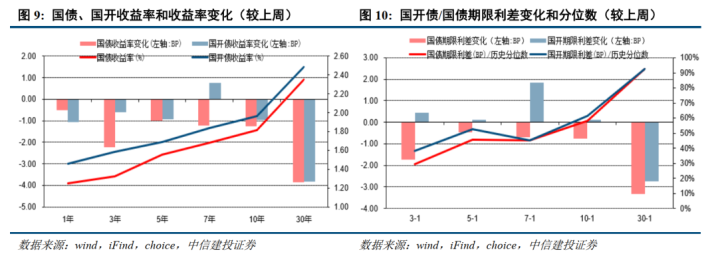 1年、3年、5年、7年、10年、30年国债收益率分辨收1.25%、1.32%、1.55%、1.68%、1.82%、2.35%,较上周变化-0.50BP、-2.23BP、-0.98BP、-1.21BP、-1.27BP、-3.84BP。