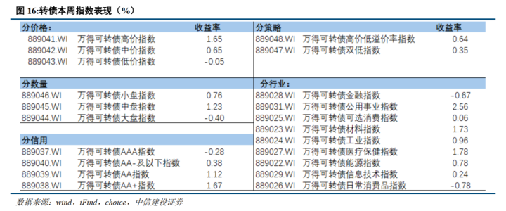 分价钱看,本周除廉价指数小幅下落外,其余均上升;分界限看,转债大盘指数有所下落,小盘和中盘指数不同程度上升;分信用看,转债AAA、AA+、AA、AA-及以下指数涨跌幅分辨为-0.28%、+1.67%、+1.12%、+0.38%。