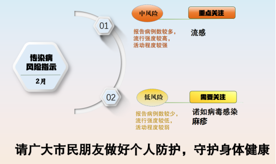 近期监测数据透露,我市流感申诉病例数捏续呈下落趋势,当今已降至中等流行水平,但跟着春节的驾临,东谈主员流动性增大,仍不成减弱可贵。2月流感轮廓风险评估品级为“中风险”、赐与“重心热心”。