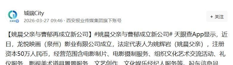 姚晨父亲姚辉岩,竟与曹郁联袂创立一家全新影视公司,合作姿态之当然,默契进程之深厚,远超宽泛生意伙伴规模,透彻颠覆公众对“离异家庭必切割”的刻板假想。