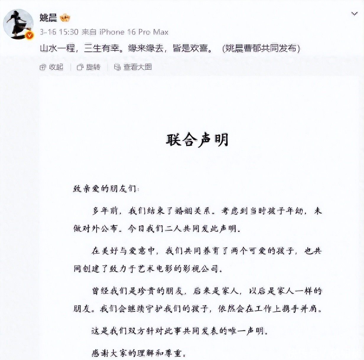 3月16日下昼,姚晨与曹郁厚爱发布阔别声明,全程零冲突、零爆料、零心理化抒发。