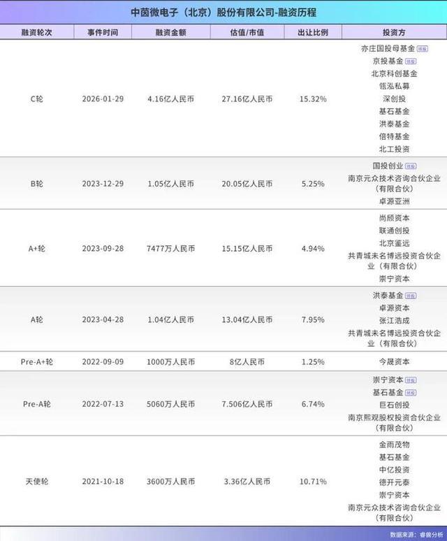 2021年10月,竖立仅8个月的中茵微电子就拿下数千万元天神轮融资,由基石本钱、金雨茂物领投,崇宁本钱、中亿明源等跟投;2022年7月,完成亿元级Pre-A轮融资;2023年4月,再获超亿元A轮融资,洪泰基金领投,张江高科、卓源本钱跟投;2023年9月,完成近亿元A+轮融资,引入尚颀本钱、联通创投等产业本钱;直至2026年1月上市前的C轮融资,公司单轮融资额达4.16亿元,投后估值约27.16亿元东说念主民币,每股成本约156.8元。