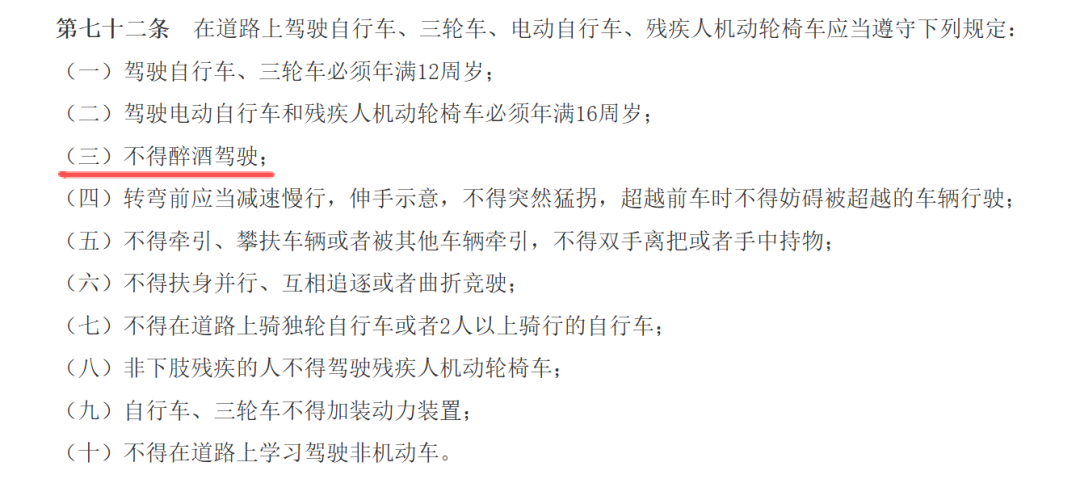 在谈路上驾驶自行车、三轮车、电动自行车、残疾东谈主活泼轮椅车不得醉酒驾驶。