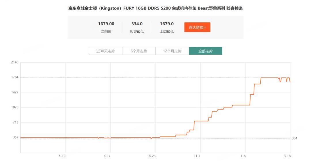以这条金士顿16GB DDR5 5200 台式机内存条为例,当今它的售价是1679元,而在半年前,只有357元就能动手。
