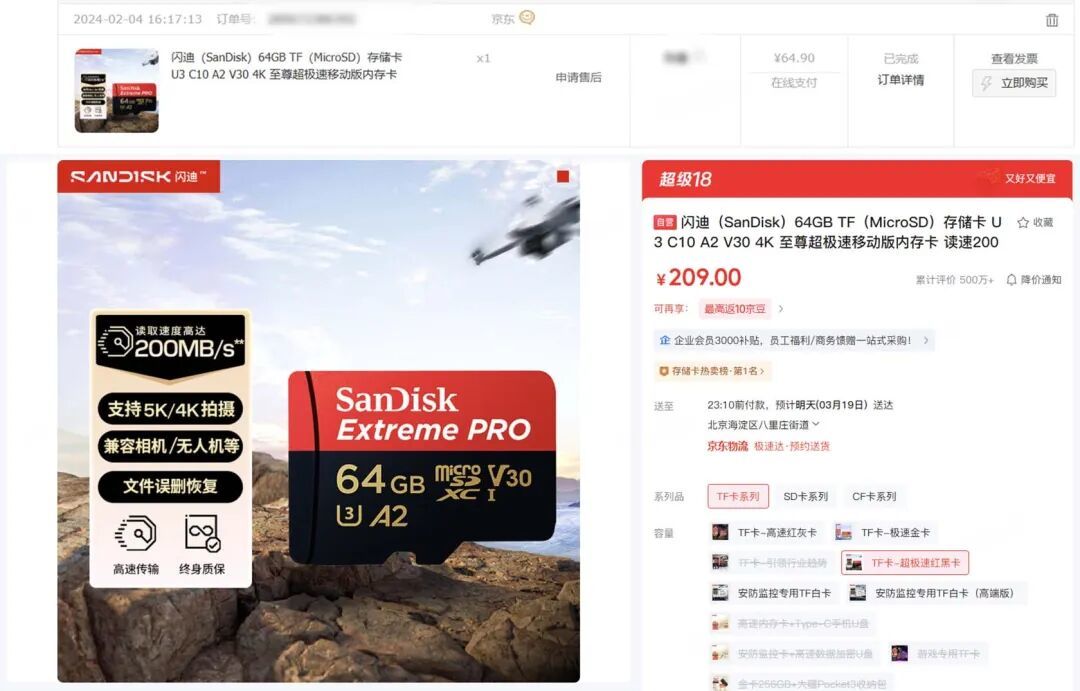 比如我在两年前给无东谈主机购买的64GB闪迪超极速红黑卡,其时是花了64.9元。但如今,这张卡在京东上依然卖到209元,这个价钱在以前能买三张。