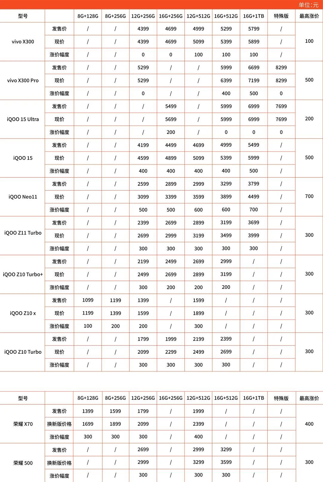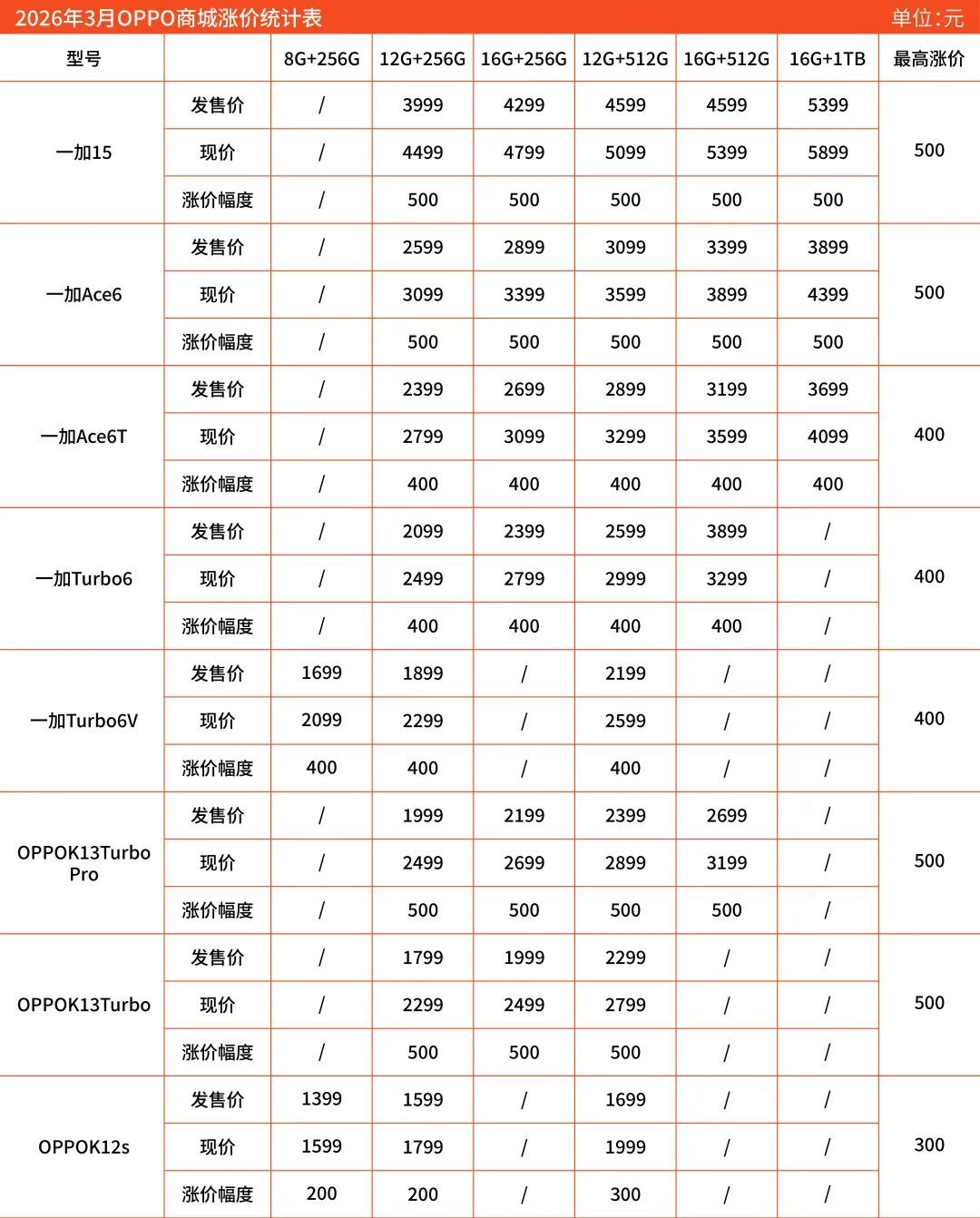 执行情况来看,涨价限制在300-500元之间,涨价幅度最高的是OPPO K13 Turbo 12+256GB版块,从1799元涨到2299元,涨幅27.8%。