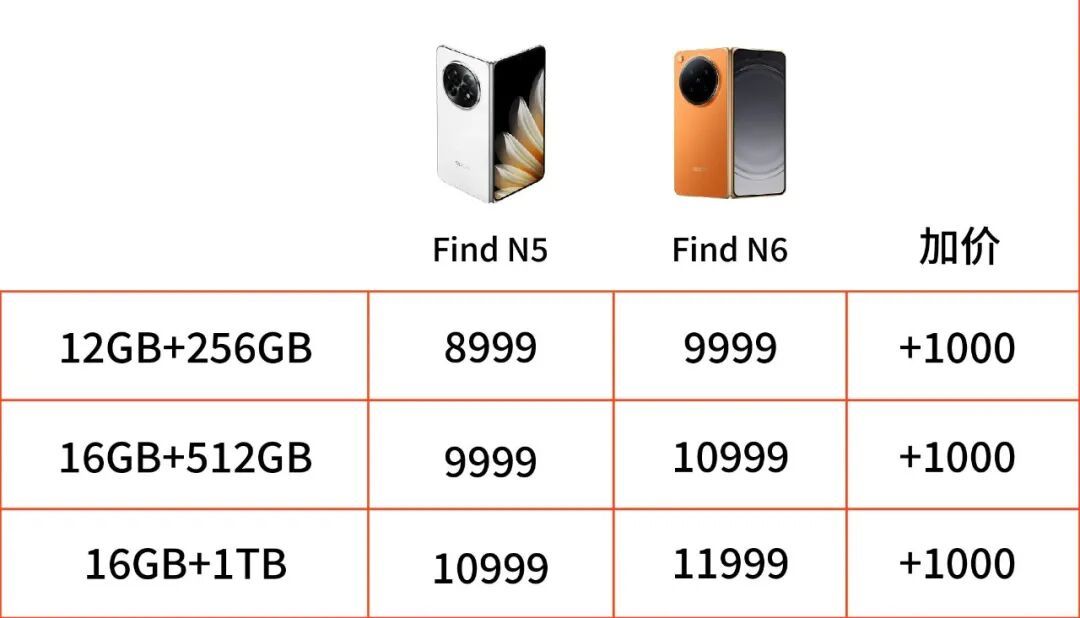 天然Find系列不在涨价限制内,但17日发售的折叠屏新机OPPO Find N6,相较上一代同规格均上升了1000元,12+256GB的起步确立也从8999元来到了9999元。
