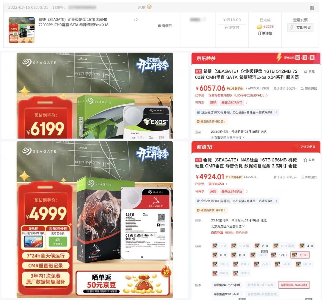四年前,我确立Nas的时候连气儿买了2块16TB的希捷星河-企业存储硬盘,花了4516元,其时细心得不成。四年夙昔,这款硬盘仅仅缓存升级到了512MB,当今的售价是一块6199元;同规格的16TB 256MB缓存 7200转的希捷酷狼NAS存储当今也要4999元,买以前2块还过剩。