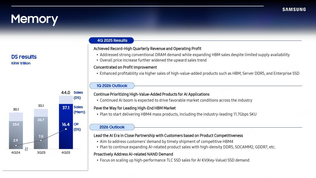 三星电子2025年第四季度财报会材料里说:内存业务在“供给受限”的情况下,靠粗鲁强盛的传统DRAM需乞降扩大HBM销售,已矣了季度营收和利润新高;同期,盈利改善主要来自HBM、管事器DDR5、企业级固态硬盘等高附加值居品。