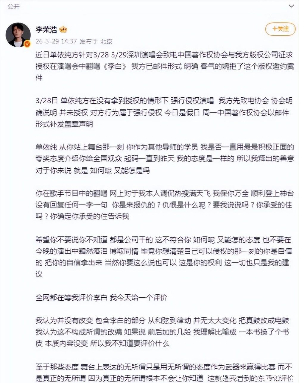 李荣浩这回是真没惯着,平直把话挑明了。3月29日,他发了一篇长文开云体育,点名单依纯在演唱会上强行改编《李白》这事儿,说是侵权。其实起先东说念主家就委婉拒却过,以为那改编版块真实难登大雅不登大雅,有点“豕窜狼逋”的意义,可单依纯那处似乎没当回事,非要唱。